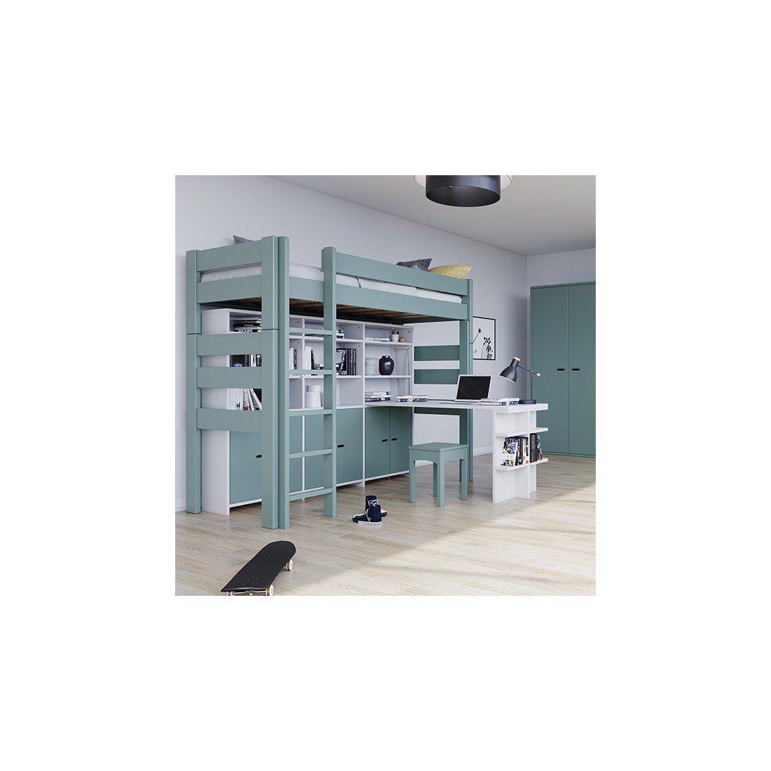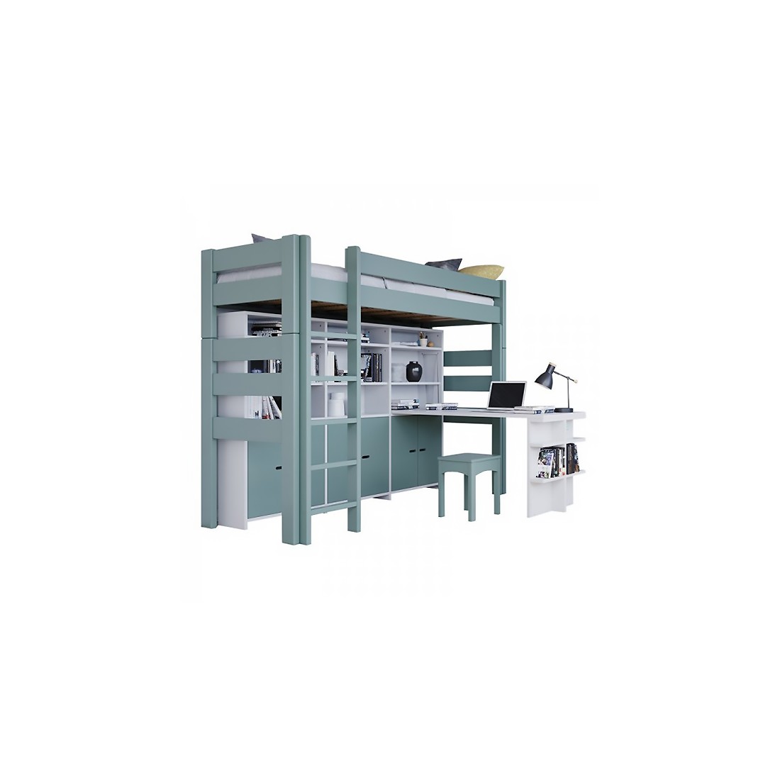 Un Lit enfant surélevé 1 place aux dimensions standard 90 x190, sous lequel s'encastre parfaitement la bibliothèque.