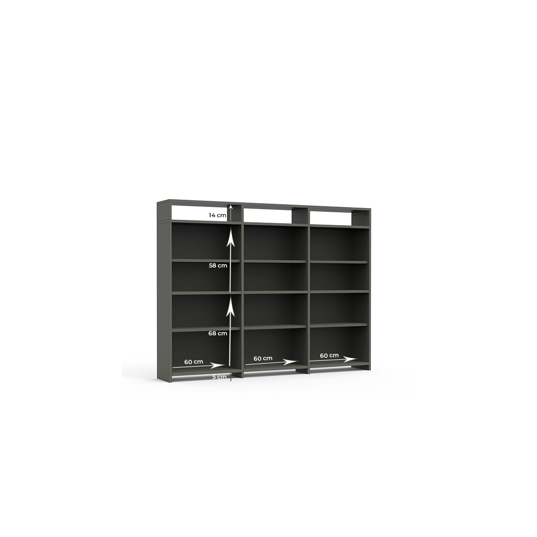 La bibliothèque est composée de 15 espaces de rangements répartis sur 5 niveaux. Les 2 premiers sont situés derrières 3 portes, très pratique pour ranger les accessoires de bureaux moins esthétiques, comme les feuilles cahiers et classeurs. La deuxième et la 4ème tablettes sont réglables en hauteur pour s'adapter à tous les besoins.