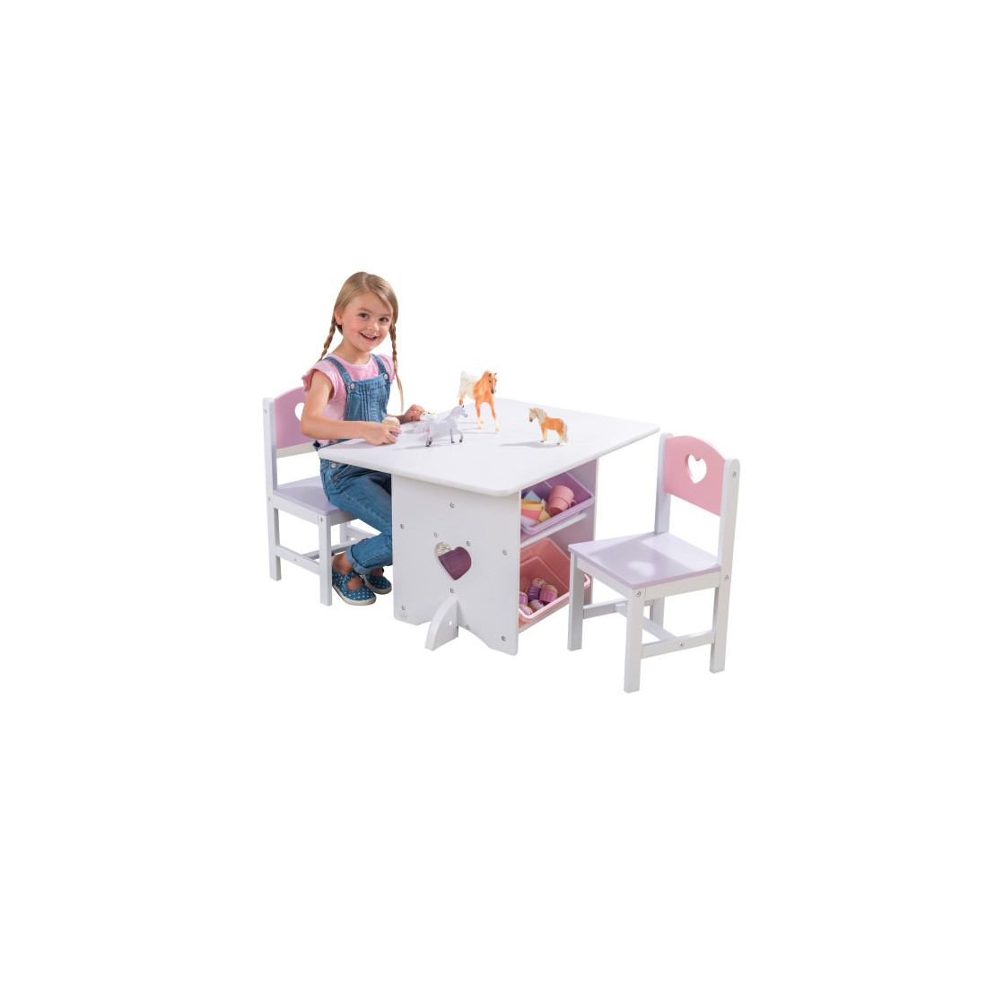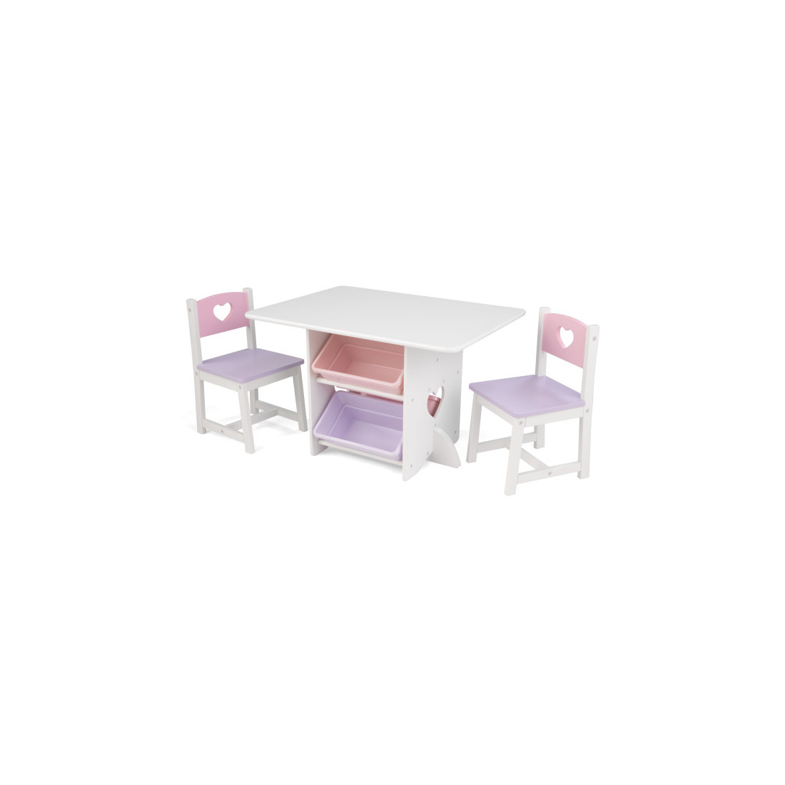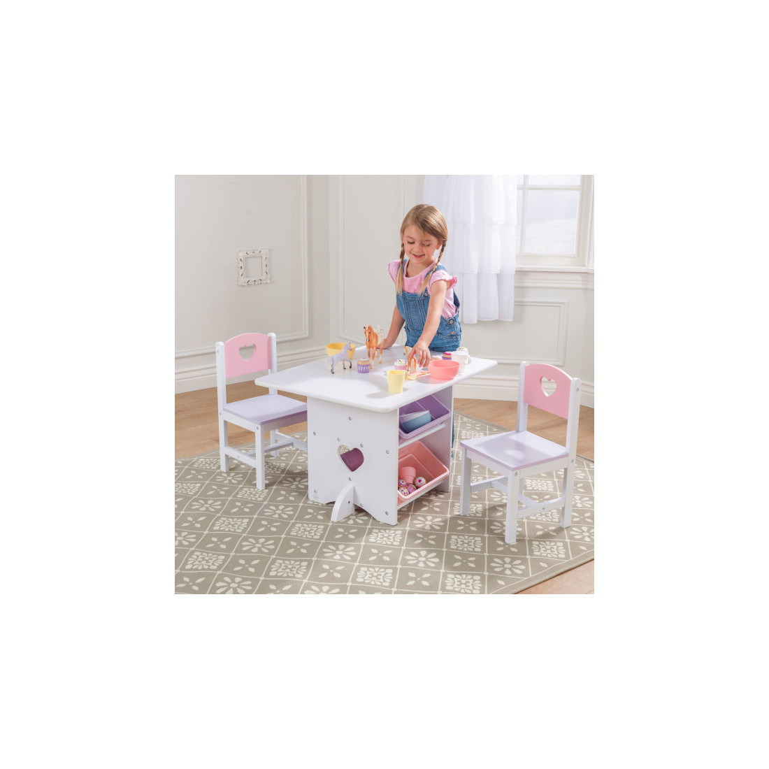 Contient une table, deux chaises et quatre bacs de rangement.