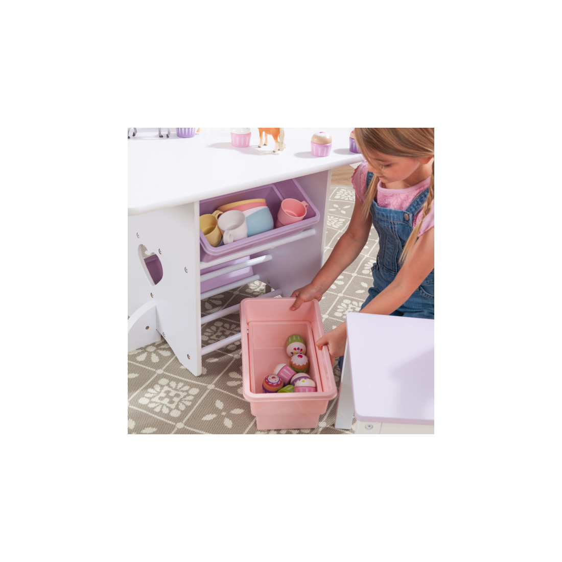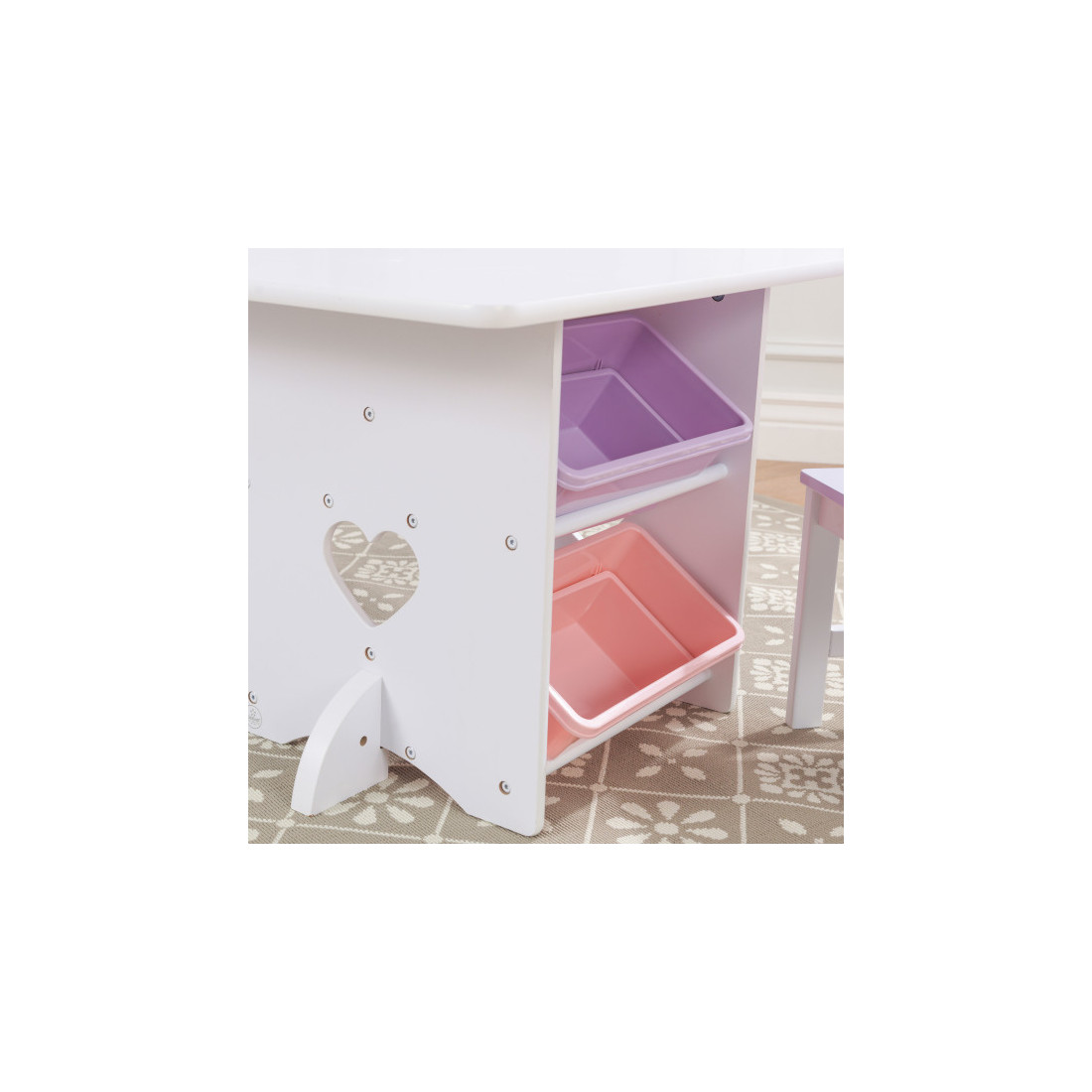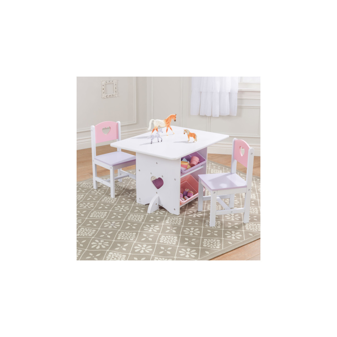 Contient une table, deux chaises et quatre bacs de rangement.