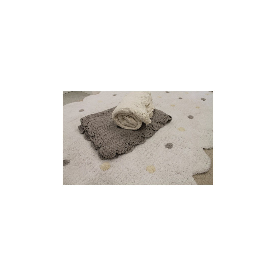 Tapis coton bébé lavable machine Couleur blanc et gris Motif petit pois gris sur un fond blanc aux bord dentelés 100% coton Dimensions : 120 X 160 cm Fabriqué en Inde, certificat de qualité ISO 9001. Respecte toutes les normes, certifié AIRTEX (norme européenne) pour la sécurité de nos enfants. Fait à la main.
