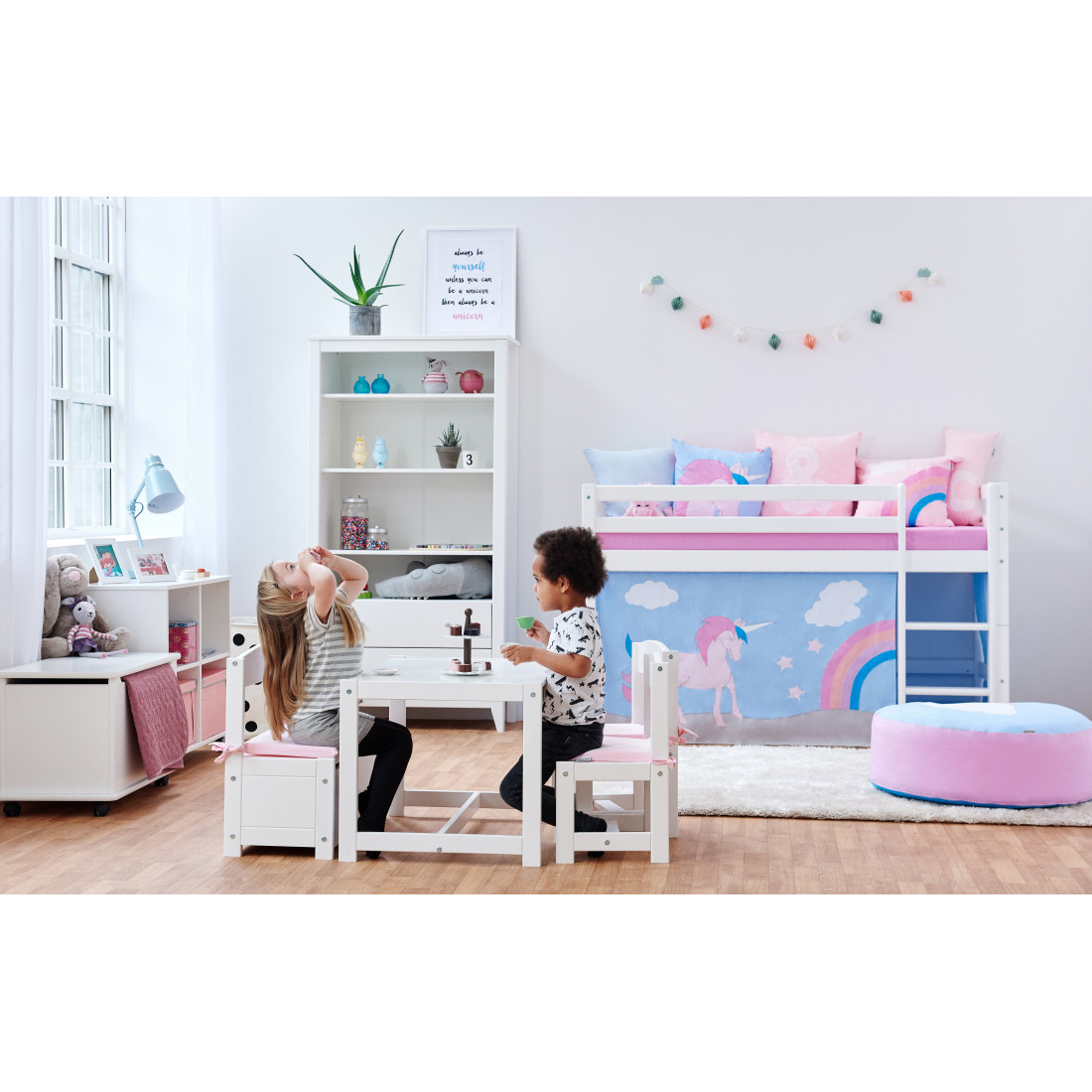 Le rideau crée une grotte confortable située sous le demi-lit haut, ce qui en fait l'endroit idéal pour la lecture ou lorsque votre enfant a besoin d'une pause du reste du monde. Décorer la grotte avec beaucoup de belles choses, telles qu'un matelas, des oreillers, des couvertures, des fêtes de fées et ainsi de suite.