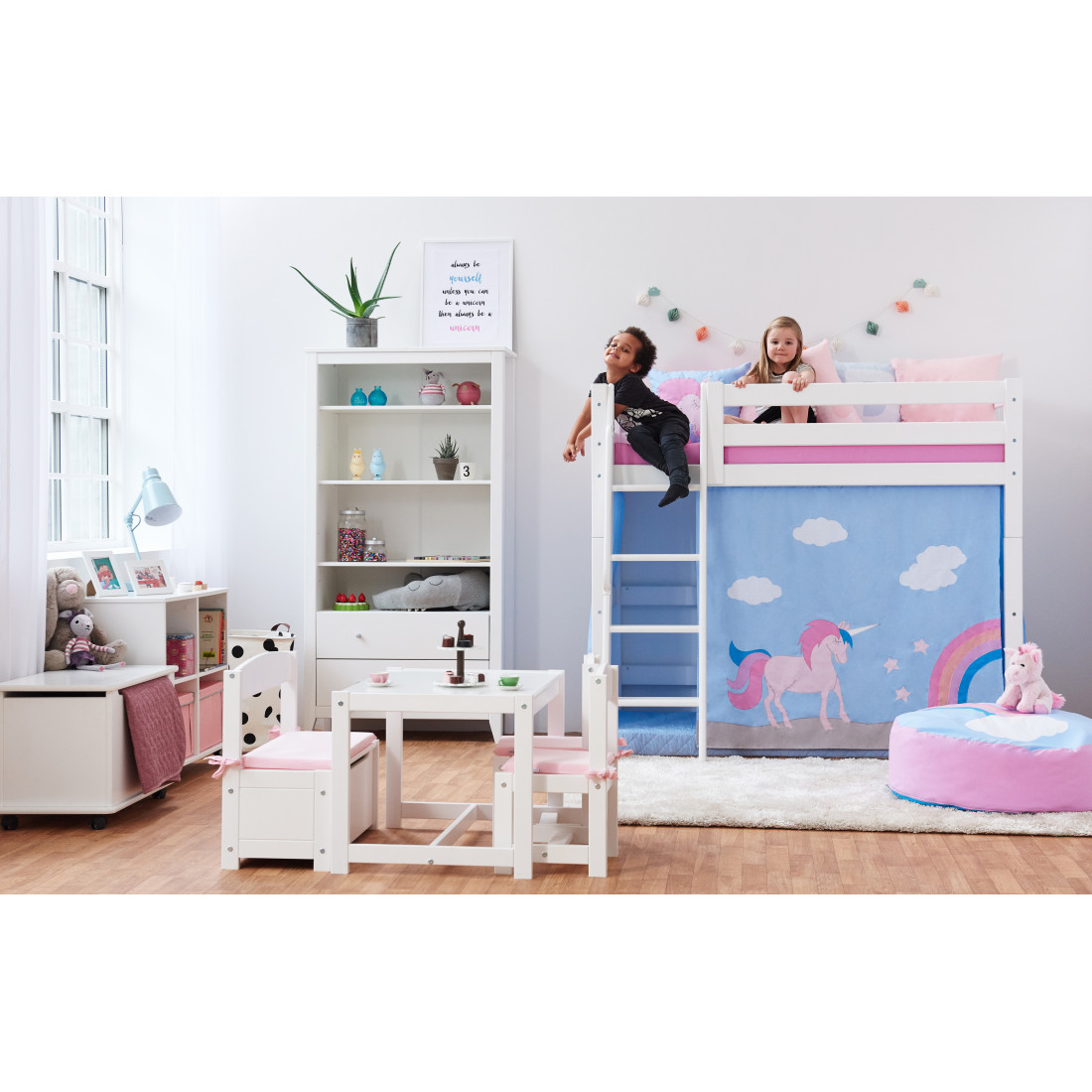 Le rideau crée une grotte confortable située au-dessous du grand lit haut, ce qui en fait l'endroit idéal pour le temps de jeu ou lorsque votre enfant a besoin d'une pause du reste du monde. Décorer la grotte avec beaucoup de belles choses, telles qu'un matelas, des oreillers, des couvertures, des fêtes de fées et ainsi de suite.