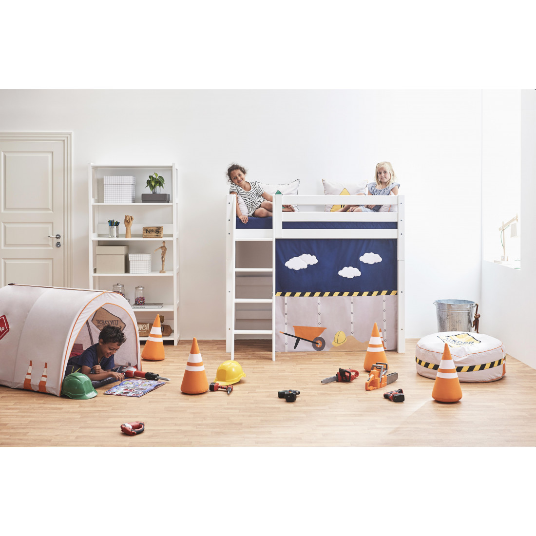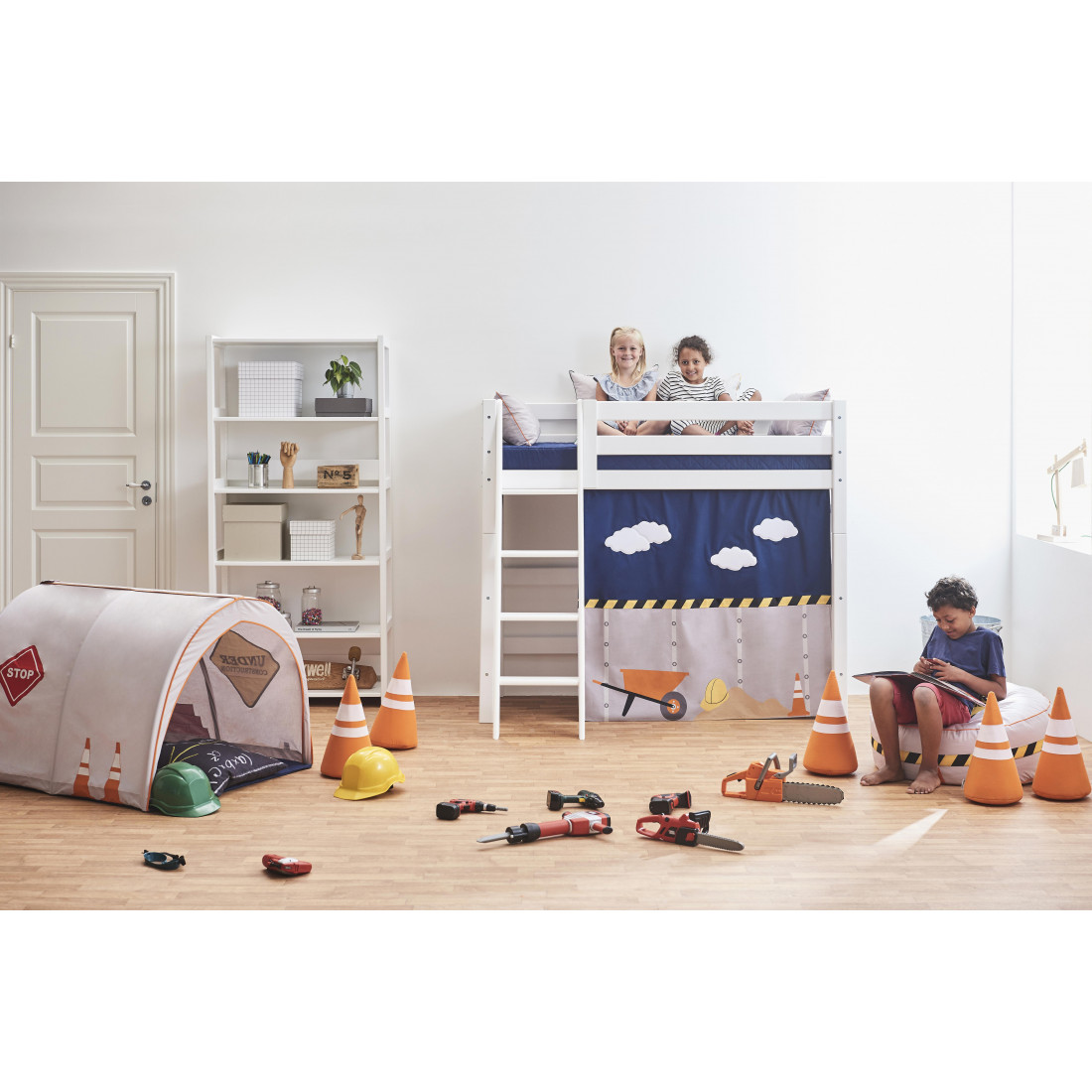 Le rideau crée une grotte confortable située au-dessous du grand lit haut, ce qui en fait l'endroit idéal pour le temps de jeu ou lorsque votre enfant a besoin d'une pause du reste du monde. Décorer la grotte avec beaucoup de belles choses, telles qu'un matelas, des oreillers, des couvertures, des fêtes de fées et ainsi de suite.