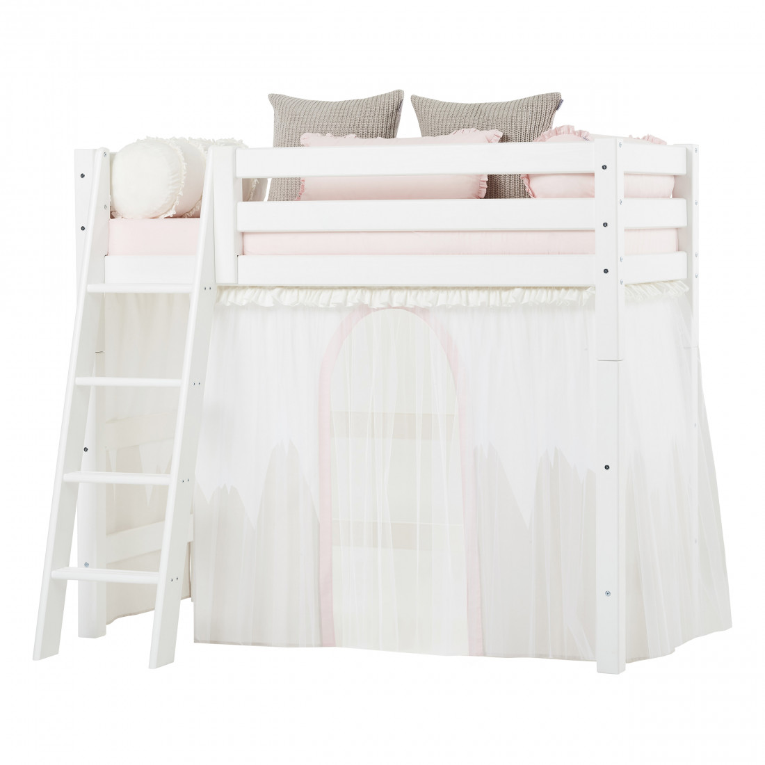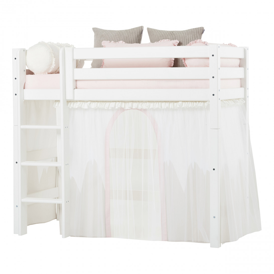 Le rideau crée une grotte confortable située au-dessous du grand lit haut, ce qui en fait l'endroit idéal pour le temps de jeu ou lorsque votre enfant a besoin d'une pause du reste du monde. Décorer la grotte avec beaucoup de belles choses, telles qu'un matelas, des oreillers, des couvertures, des fêtes de fées et ainsi de suite.