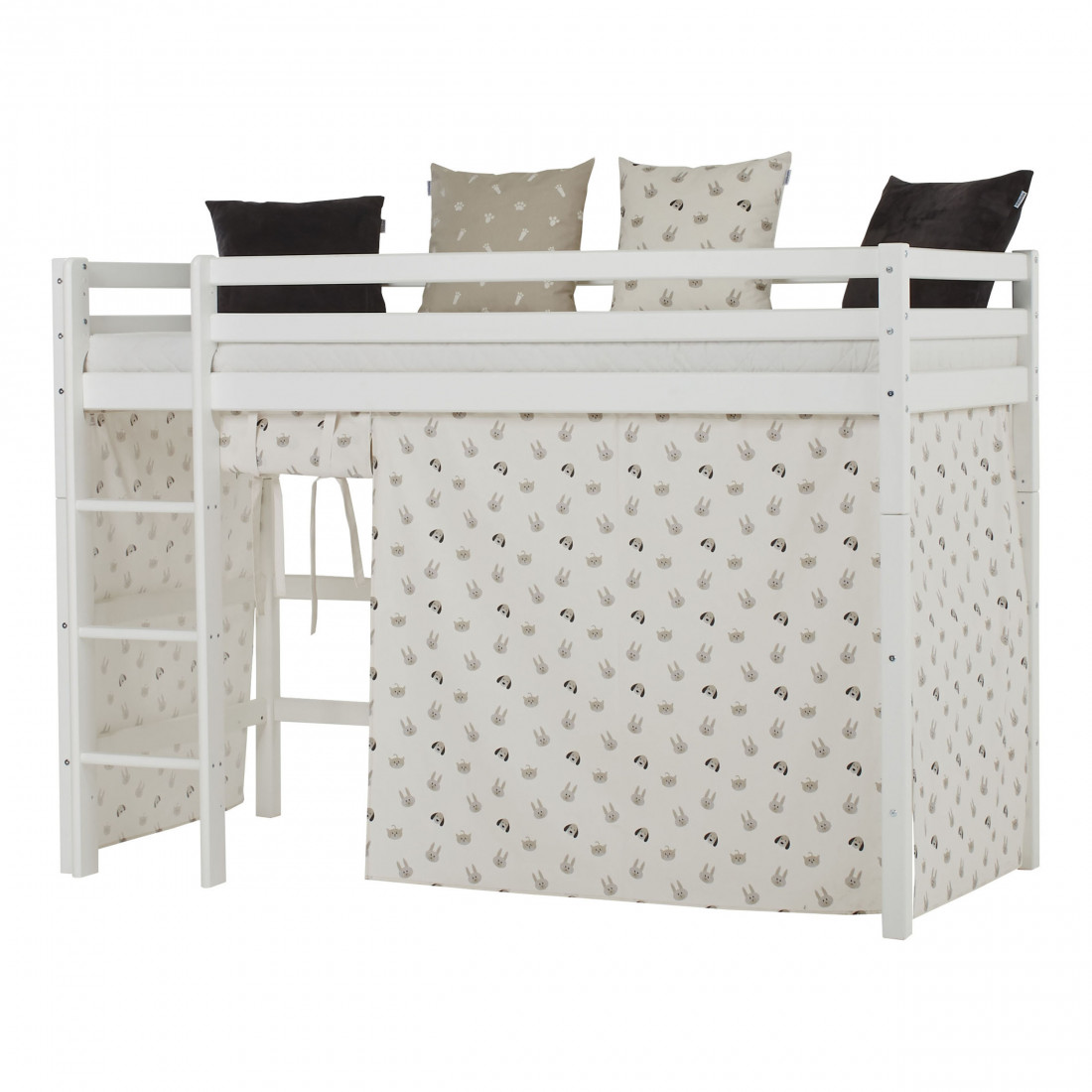 Le rideau pour les lits intermédiaux (90x200cm) crée un monde d'aventure magique au milieu de la chambre des enfants. Soudain, le lit est le point de départ des voyages et des histoires passionnantes. Le rideau de lit crée également une grotte confortable sous le lit mi-haut idéal pour jouer ou lorsque votre enfant a besoin d'une petite pause du reste du monde. En raison de la hauteur sous les lits entre les enfants mi-hauts, vous pouvez installer la zone avec matelas, chaînes de fanion, éclairage à LED, oreillers et bien plus encore. Ou vous pouvez créer une zone d'artisanat ou un endroit pour écrire et étudier sous le lit. Avec Hoppekids Animaux, vous apportez la vie à la chambre des enfants! Le rideau vierge avec l'impression mignonne lapin, chat et dogfaces est exactement ce dont une chambre d'enfants a besoin. Chien et chat jouent un rôle important dans les animaux domestiques, que ce soit comme motif de patte sur les oreillers ou les rideaux ou comme oreiller de jeu et haricot. Les multiples combinaisons de couleurs avec une couvre-lit maison, des rideaux, des oreillers et des accessoires font des animaux de compagnie une collection avec de nombreuses mesures de conception. Profitez des couleurs tendances grises en gris gris, vierge ou d'argent et créez une belle retraite pour vos enfants.