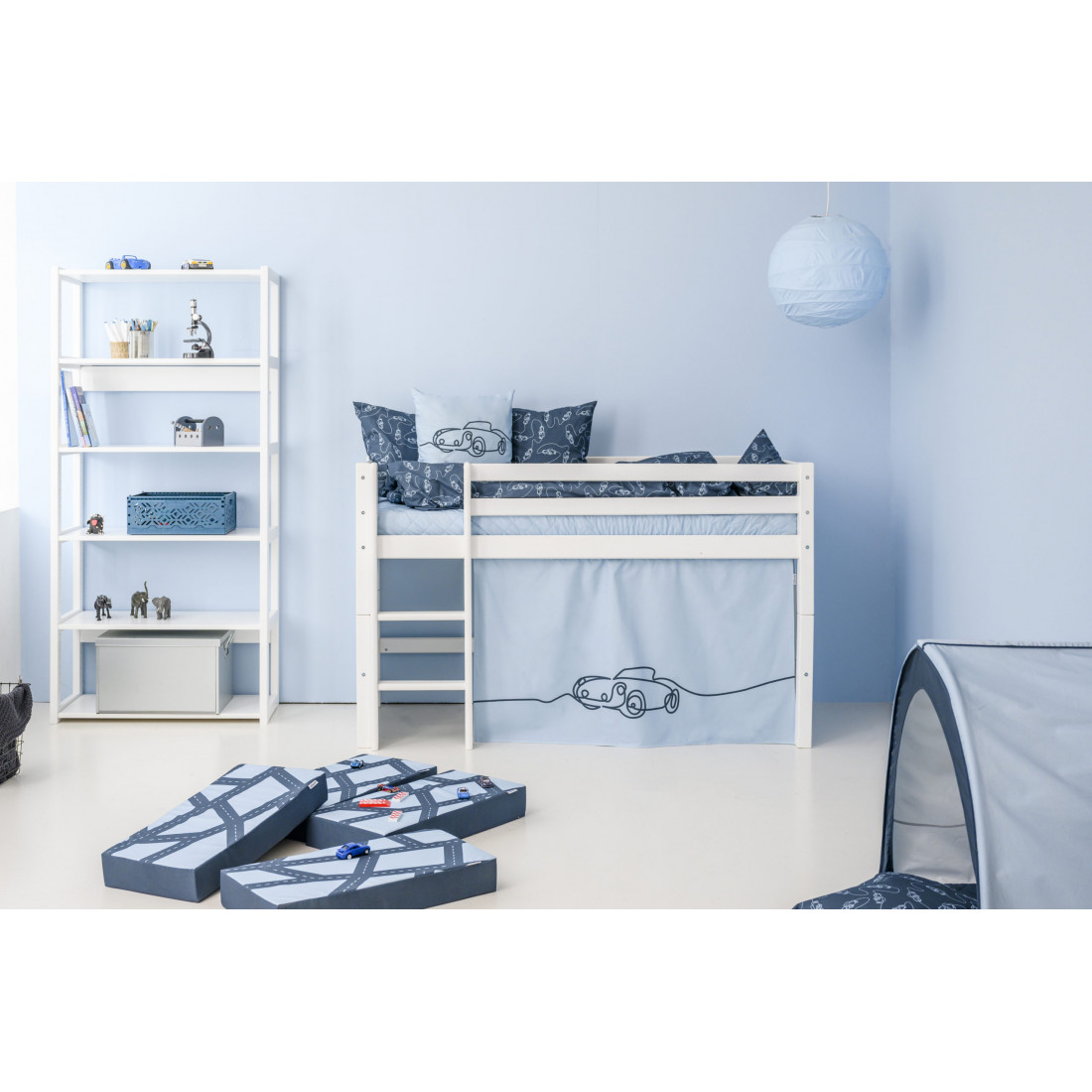 Les rideaux 'Voitures' conviennent à la fois des lits Gremhashighs basiques et haut de gamme de Hoppekids de 70 x 160 cm. Le rideau est composé de tissus certifiés Ecotex et est lavable à 30 degrés C. Le rideau crée une petite grotte sous le lit pour le costume et les secrets. Le rideau et d'autres accessoires sont un moyen facile et abordable de changer l'expression de la pièce. Avec les autres éléments des univers, vous pouvez facilement fournir une salle imaginative pour des rêves volants. Belles nuances modernes de bleu offrent une tonalité de tonalité de tonalité. Le motif, dessiné sans aucune discontinuité, est un véritable caresseur et remplit chaque ventilateur de voiture avec joie. Les voitures sont la nouvelle collection pour tous ceux qui veulent quelque chose de simple et discret, mais ne veut toujours pas faire sans design élégant et élégant. "Il est absolument branché de travailler avec des modèles graphiques simples. La couleur joue un rôle majeur dans l'effet général", explique Susanne Nielsen de l'équipe de design. Le bleu clair des rideaux et des couvre-lit, le bleu plus sombre du linge de lit et le mélange de couleurs pour les coussins et les fanions font une expérience de couleur idéale dans la chambre des enfants.