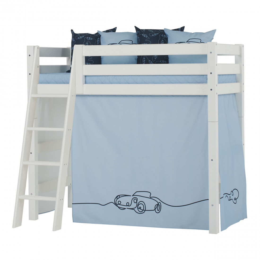 Le rideau 'voitures' pour Hoppekids 70x160 cm Midhigh Lits (Basic & Premium) crée un monde d'aventure magique au milieu de la chambre des enfants. Soudain, le lit est le point de départ des voyages et des histoires passionnantes. Le rideau de lit crée également une grotte confortable sous le lit mi-haut idéal pour jouer ou lorsque votre enfant a besoin d'une petite pause du reste du monde. En raison de la hauteur sous les lits entre les enfants mi-hauts, vous pouvez installer la zone avec matelas, chaînes de fanion, éclairage à LED, oreillers et bien plus encore. Ou vous pouvez créer une zone d'artisanat ou un endroit pour écrire et étudier sous le lit. Belles nuances modernes de bleu offrent une tonalité de tonalité de tonalité. Le motif, dessiné sans aucune discontinuité, est un véritable caresseur et remplit chaque ventilateur de voiture avec joie. Les voitures sont la nouvelle collection pour tous ceux qui veulent quelque chose de simple et discret, mais ne veut toujours pas faire sans design élégant et élégant. "Il est absolument branché de travailler avec des modèles graphiques simples. La couleur joue un rôle majeur dans l'effet général", explique Susanne Nielsen de l'équipe de design. Le bleu clair des rideaux et des couvre-lit, le bleu plus sombre du linge de lit et le mélange de couleurs pour les coussins et les fanions font une expérience de couleur idéale dans la chambre des enfants.
