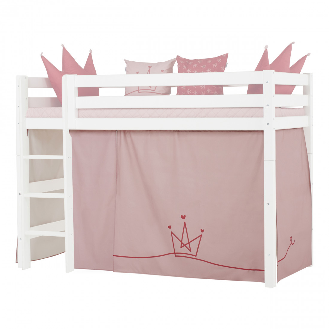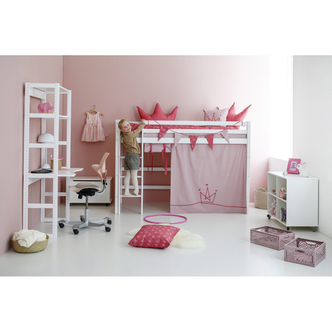 Le rideau 'Princess' pour Hoppekids 90x200 cm Midhights Lits (Basic & Premium) crée un monde d'aventure magique au milieu de la chambre des enfants. Soudain, le lit est le point de départ des voyages et des histoires passionnantes. Le rideau de lit crée également une grotte confortable sous le lit mi-haut idéal pour jouer ou lorsque votre enfant a besoin d'une petite pause du reste du monde. En raison de la hauteur sous les lits entre les enfants mi-hauts, vous pouvez installer la zone avec matelas, chaînes de fanion, éclairage à LED, oreillers et bien plus encore. Ou vous pouvez créer une zone d'artisanat ou un endroit pour écrire et étudier sous le lit. La rose pâle et la rose baroque sont les deux couleurs de tendance pour les princesses partout dans le monde. Un concept fort, l'autre délicat et ensemble en tant que concept de ton-ton dans la collection de princesse Hoppekids imbattable. Ajoutez à cela le dessin de la ligne avec la couronne et nous avons un classique moderne de design pour la chambre des enfants. Simple, élégant et pourtant incontestablement avec une espèce enjouée, de sorte que la chambre des enfants se sent immédiatement chaude. Que ce soit combiné avec des lits de couleur ou avec des lits classiques pour enfants blancs, la princesse a toujours fière allure. Les coussins, la couverture du lit de la maison, les rideaux et le tunnel de jeu tout conviennent parfaitement. Un petit univers pour votre princesse.