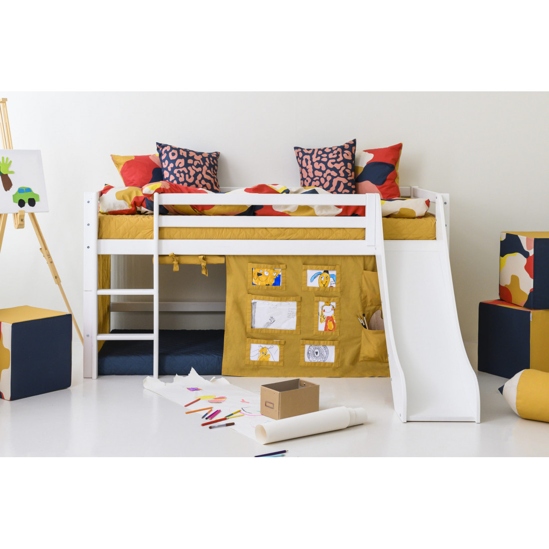 Le rideau de Créateur en automne jaune convient à la fois les lits à moitié haut et les lits superposés de la série de lit pour enfants de base et haut de gamme de Hoppekids (surface moulante 90x200cm). Le rideau est constitué de coton certifié Ecotex et est lavable à 30 ° Celsius. Le rideau crée une petite grotte sous le lit comme une retraite et des secrets, comme espace de stockage ou pour jouer. Le rideau et d'autres accessoires correspondants sont un moyen simple et peu coûteux de changer la pièce. Avec des oreillers, des tunnels de jeu, des rideaux et d'autres accessoires exclusifs, vous pouvez créer un concept de chambre magnifique et universel qui vous aide à donner une structure de la pièce et donnez à l'enfant de nombreuses suggestions pour jouer. La collection Créateur convainc avec des couleurs modernes, adaptées aux garçons et aux filles, et inspire les enfants à faire de l'artisanat et de peindre. Les rideaux de lit offrent de l'espace pour les dernières créations des enfants et donc la possibilité de concevoir sa propre chambre à nouveau et à nouveau. «Grâce aux poches sur le rideau, il y a même un espace de rangement supplémentaire. Ce n'est pas seulement un rideau, c'est une partie importante de la chambre des enfants. "Dit Susanne Nielsen de l'équipe de design Hoppekids. Les motifs sur les oreillers, le linge de lit et les cubes de sièges sont colorés et soutiennent ainsi la série de créations de votre enfant. Les rideaux en automne jaune et bleu orion, d'autre part, sont discrètement restreints afin de faire ressortir les œuvres d'art des enfants de la meilleure façon possible. "