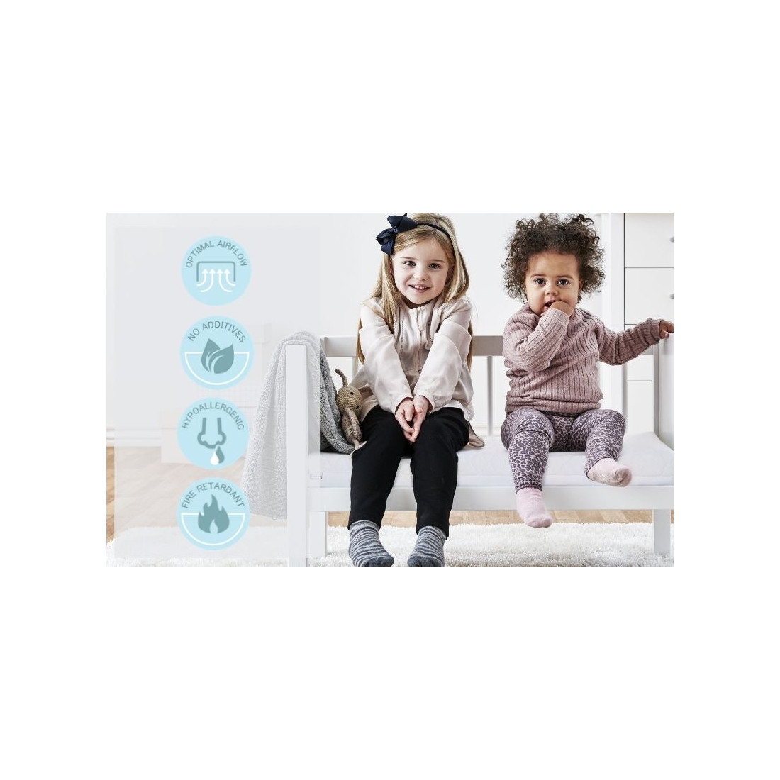 La couverture du matelas est cousue par un tissu certifié Oeko-Tex 100. Il a une fermeture à glissière sur 3 côtés, ce qui facilite la suppression. Selon les normes de sécurité, la couverture du matelas est légèrement plus grande que le matelas lui-même, en cas de rétrécissement d'un peu lorsqu'il est lavé.