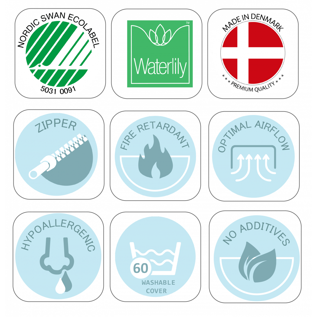 Le noyau de matelas est en mousse de Waterlily®. Waterlily® Mousse est un produit de qualité respectueux de l'environnement qui offre une élasticité et un confort doux, ce qui est encore meilleur que la mousse froide. Waterlily est un matériau respectueux de l'environnement et durable qui prend en compte la sécurité, la santé et les aspects environnementaux tout au long de la vie du produit. Waterlily maintient la forme et fournit ainsi un confort durable. Le noyau de matelas est ignifuge sans additifs.