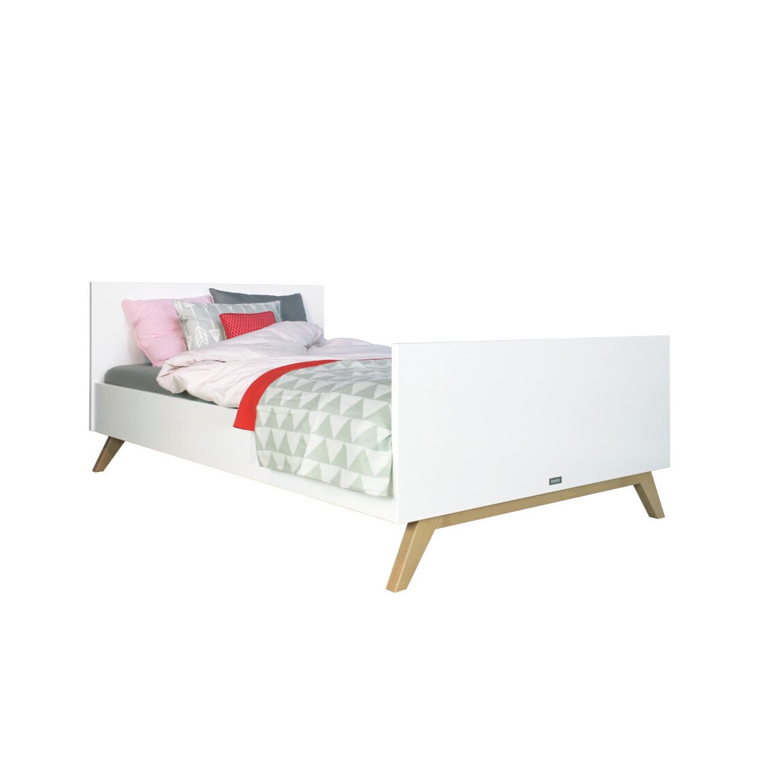 Grand lit moderne pour adolescent Lynn, au look scandinave : laque blanche opaque (base aqueuse) avec un pied de lit en bois naturel à pattes inclinées, caractéristique de la série Lynn. Lit extra large : 120 x 200 cm (lit jumeau). Idéal pour les invités. Le lit comprend un sommier à lattes en bois, à l'exclusion du matelas.