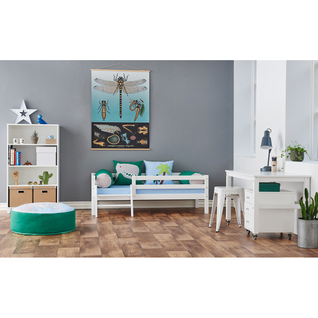 Sous le lit, vous trouverez beaucoup de place pour le stockage - par ex. Avec les grands tiroirs spacieux sur roues de Hoppekids.