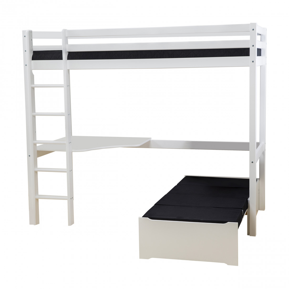 Sous le lit, il y a beaucoup d'espace de plancher supplémentaire qui vous permet de créer un coin salon, un espace de travail, un stockage ou une pièce à jouer. Il y a 135 cm du dessous de la couchette au sol - seule l'imagination définit la limite pour ce que vous pouvez utiliser tout cet espace pour!