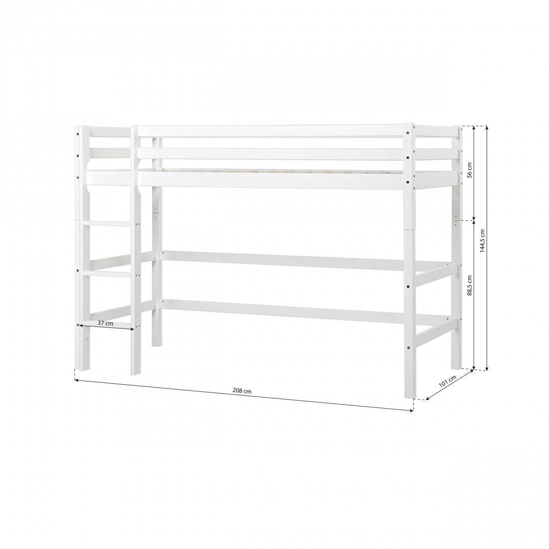 Avec une hauteur totale de177 cm Le lit est parfait pour le plus grand enfant qui veut grimper au lit, mais n'est toujours pas assez grand pour un sommet élevé.
