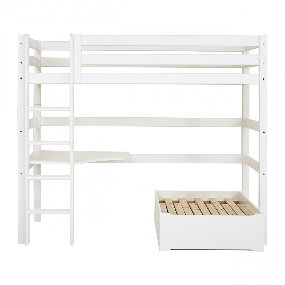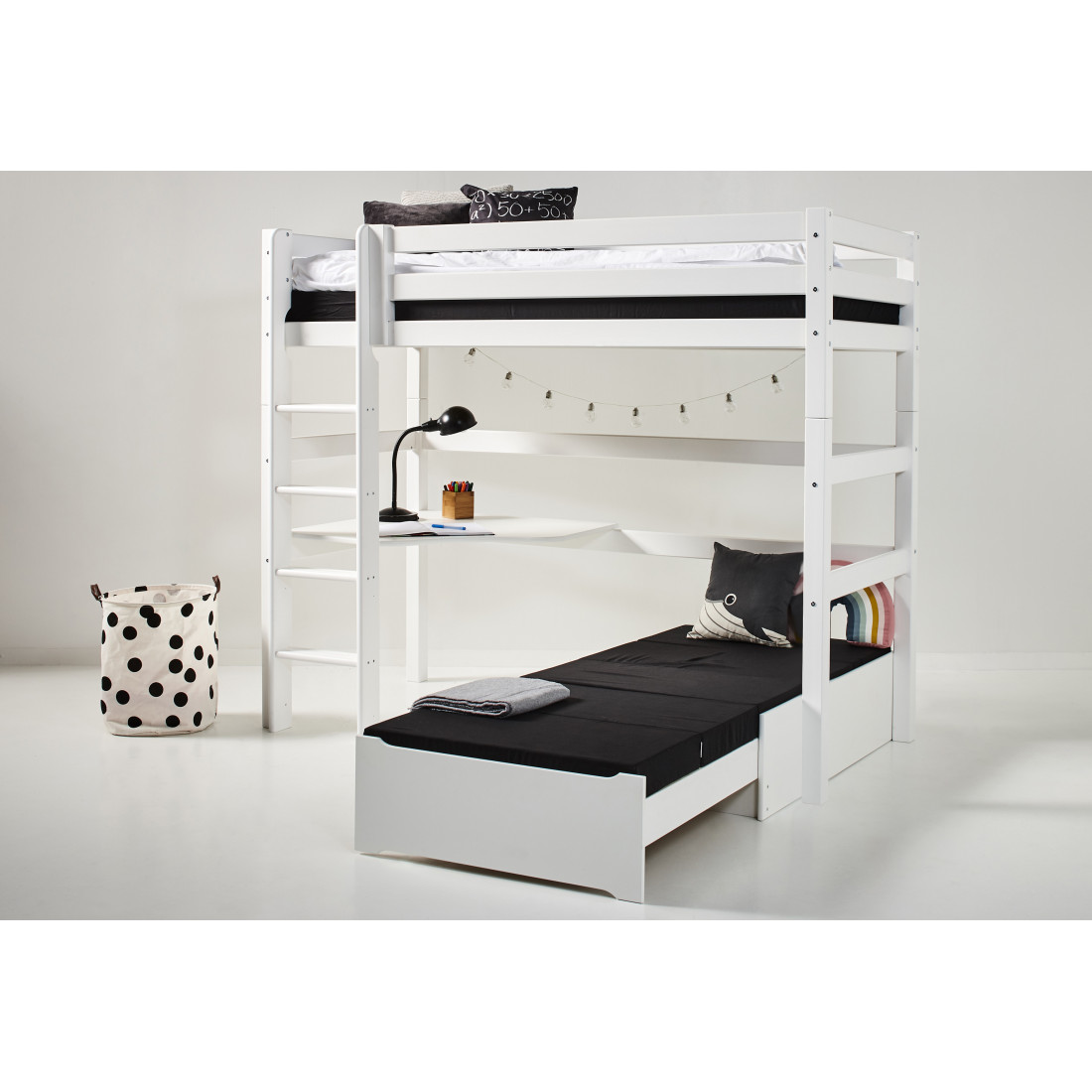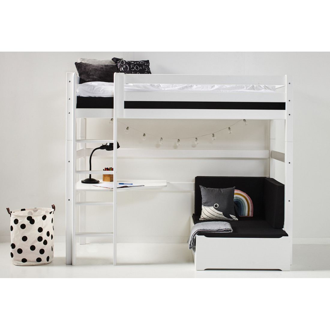 Sous le lit, il y a beaucoup d'espace de plancher supplémentaire qui vous permet de créer un coin salon, un espace de travail, un stockage ou une pièce à jouer. Il y a 135 cm du dessous de la couchette au sol - seule l'imagination définit la limite pour ce que vous pouvez utiliser tout cet espace pour!