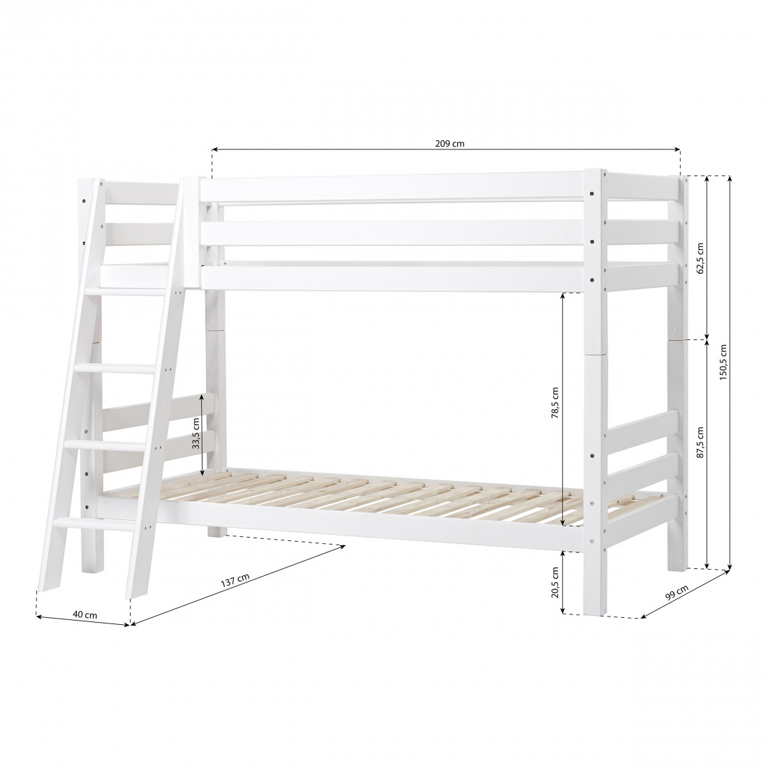 Lit superposé haut de gamme complet taille 90x200 cm de Hoppekids. Ce lit vous donnera plus d'espace de plancher dans la chambre car vous obtenez deux superposés pour l'espace d'un. En dessous de la couche inférieure, il y a beaucoup de place pour le stockage.