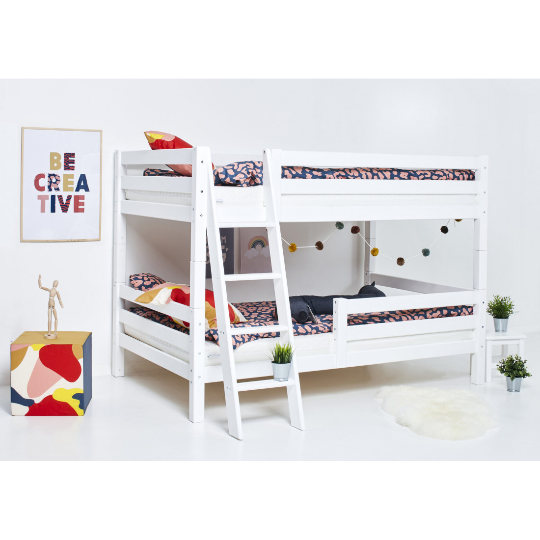 Le lit superposé Premium Hoppekids en 120x200cm avec une échelle inclinée et un rail de sécurité supplémentaire est un lit pour enfants pour deux de pins nordiques solides, attribué à l'écolabel nordique. La hauteur sous le lit est respectivement de 20 et 108 cm, la hauteur entre le premier et le deuxième lit est de 78 cm. Hoppekids Premium est un système de lit flexible et durable avec un confort maximum et la plus grande attention possible à la sécurité. Ajouté à ceci est sa stabilité et sa durabilité, ainsi que la large gamme de modules et d'accessoires. La série est basée sur le lit junior. Vous pouvez modifier le lit selon les besoins en utilisant divers modules et accessoires tels que des échelles ou des diapositives. Grâce à sa flexibilité et à sa durabilité, la prime est idéale pour être transmise à des frères et sœurs plus jeunes et se sent toujours comme un lit neuf et unique pour vos enfants. Les avantages importants de la prime en un coup d'œil: - Garantie de toute la vie contre les défauts de fabrication - Garantie de disponibilité de cinq ans sur les accessoires et les modules - Construction particulièrement stable - Sécurité maximale due à des côtés de lit extra-élevés - plus de confort en raison du cadre à roulettes ou du cadre à lattes à rouleau - Système modulaire unique - (presque) possibilités sans fin - attribué l'épaisseur de l'écolabelle Nordic: 65x65mm - Max. Hauteur de matelas pour hophekids Cots Premium: 12cm