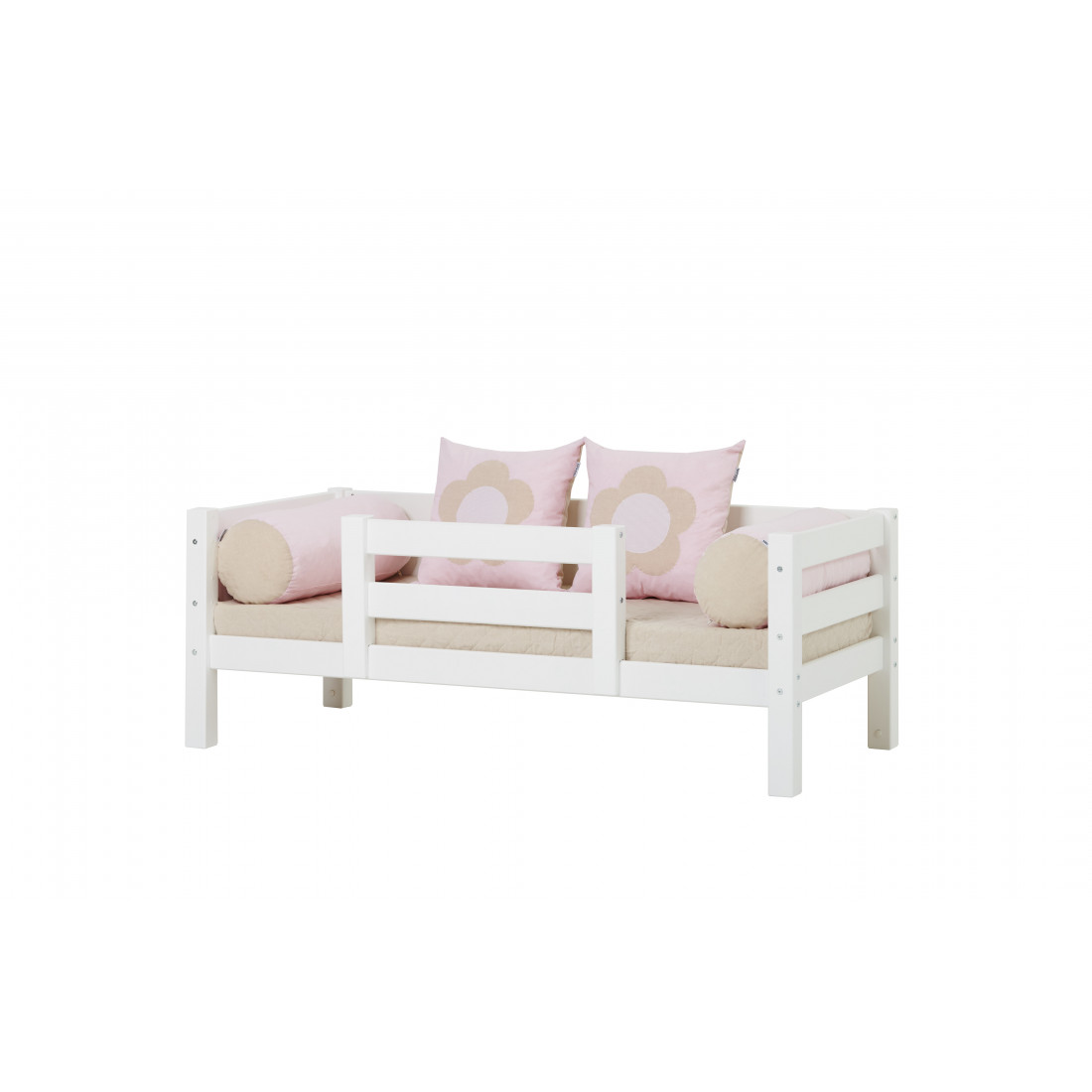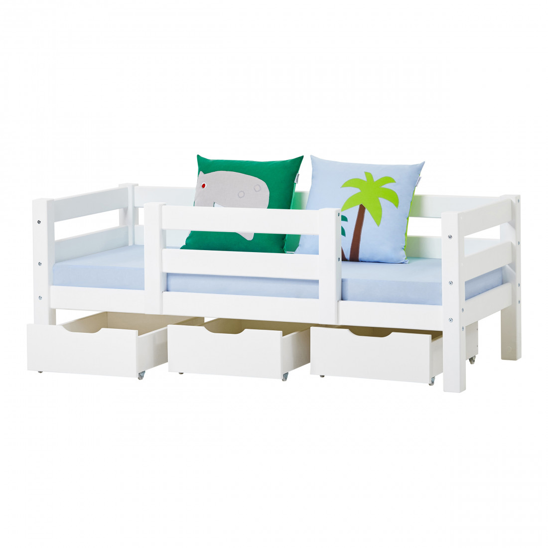 Si le lit est utilisé seul, c'est le lit de jour idéal ou le canapé-lit. Sous le lit, vous trouverez beaucoup de place pour le stockage - par ex. Avec les grands tiroirs spacieux sur roues de Hoppekids.