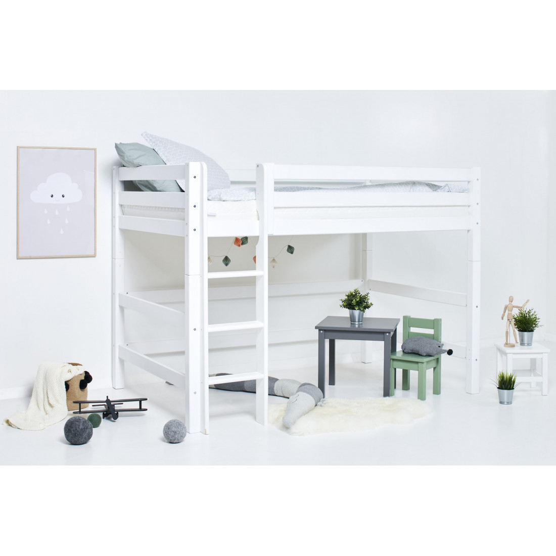 Le lit en hophekids Premium Midhigh en 120x200cm avec une protection continue et une échelle droite est un lit pour enfants en pin nordique solide, attribué à l'écolabel nordique. La hauteur sous le lit est de 108 cm, la hauteur de couchage est env. 120cm. Premium est un système de lit flexible et durable avec le plus haut niveau de confort et la plus grande attention possible à la sécurité. Ajouté à ceci est sa stabilité et sa durabilité, ainsi que la large gamme de modules et d'accessoires. La série est basée sur le lit junior. Vous pouvez modifier le lit selon les besoins en utilisant divers modules et accessoires tels que des échelles ou des diapositives. Grâce à sa flexibilité et à sa durabilité, la prime est idéale pour être transmise à des frères et sœurs plus jeunes et se sent toujours comme un lit neuf et unique pour vos enfants. Les avantages importants de la prime en un coup d'œil: - Garantie de toute la vie contre les défauts de fabrication - Garantie de disponibilité de cinq ans sur les accessoires et les modules - Construction particulièrement stable - Sécurité maximale due à des côtés de lit extra-élevés - plus de confort en raison du cadre à roulettes ou du cadre à lattes à rouleau - Système modulaire unique - (presque) possibilités sans fin - attribué l'épaisseur de l'écolabelle Nordic: 65x65mm - Max. Hauteur de matelas pour hophekids Cots Premium: 12cm