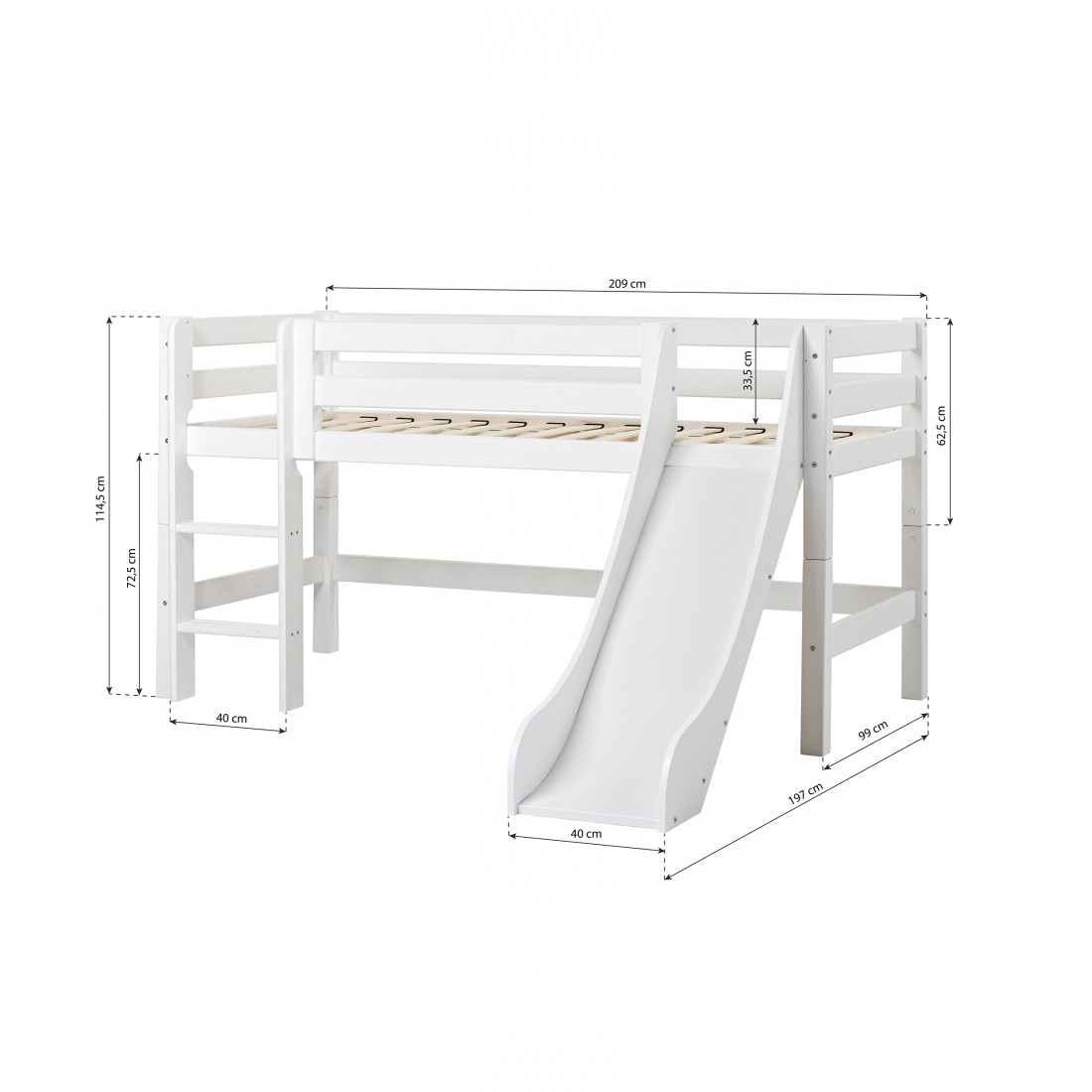 Le demi-lit haut a une hauteur parfaite, car il y a beaucoup de place pour jouer ou stockage sous le lit, mais le lit peut toujours se sentir en sécurité pour des enfants encore plus petits. La montée de l'échelle entraînera les compétences motrices et la vue du haut du lit est un favori d'un enfant.