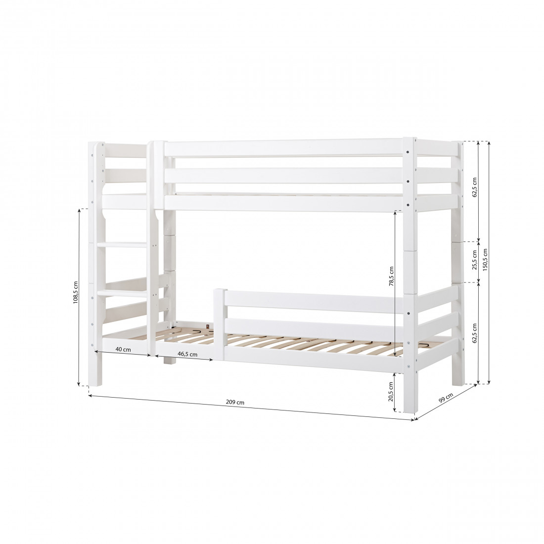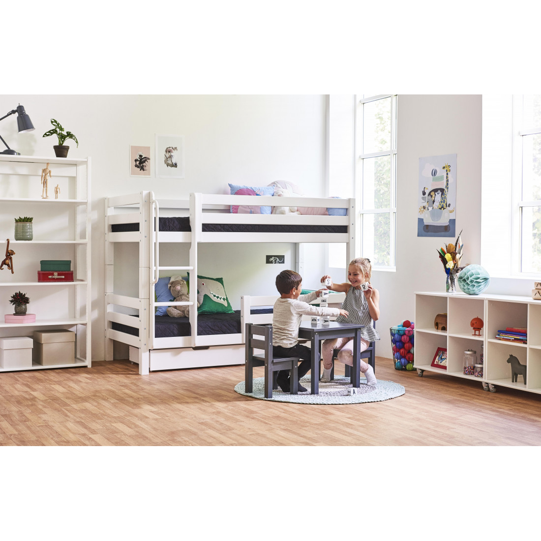 Lit superposé haut de gamme complet taille 90x200 cm de Hoppekids. Ce lit vous donnera plus d'espace de plancher dans la chambre car vous obtenez deux superposés pour l'espace d'un. En dessous de la couchette inférieure, il y a beaucoup de place pour le stockage.Les couchettes sont équipées de rails de sécurité pour plus de sécurité et de confort.