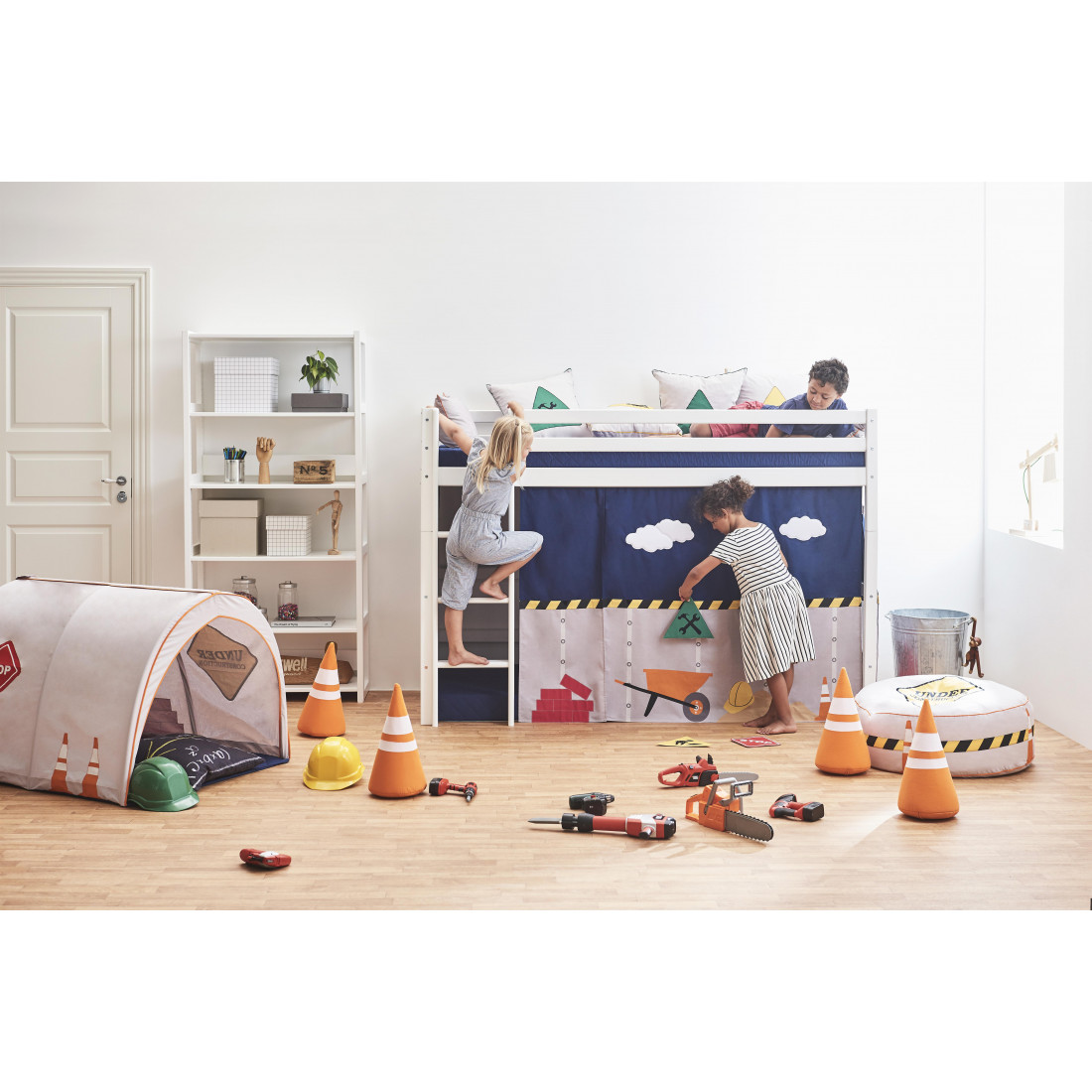 Sous le lit, vous trouverez une place de place pour le stockage ou un espace de plancher supplémentaire. Il y a 108 cm du sol au dessous du lit. Cet espace est parfait comme une "pièce dans la chambre" - une aire de jeux magique, un rangement ou un espace de travail.